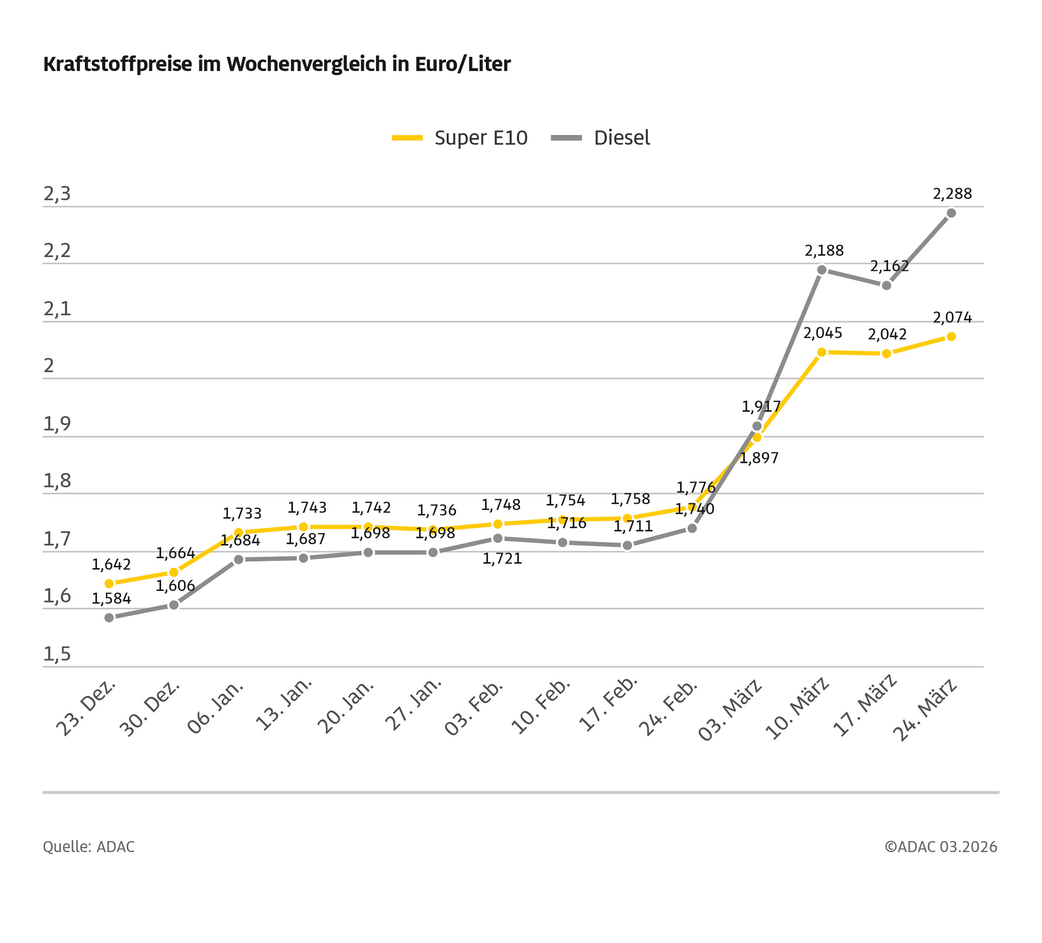 Im Laufe der vergangenen Woche erreichten die Preise beider Kraftstoffsorten ihre jeweiligen Jahreshöchststände. Super E10 kostete am vergangenen Freitag (20.3.2026) 2,086 Euro, Diesel am Montag (23.3.2026) im Schnitt 2,310 Euro. Damit lag der Dieselpreis nur noch 1,1 Cent unter dem Allzeithoch vom März 2022. Wesentlicher Auslöser für die Preissprünge war der gestiegene Ölpreis infolge des Kriegs im Iran und der Auswirkungen auf die Golfregion sowie die Drohung der Kriegsparteien, den Konflikt weiter zu eskalieren. Zwischenzeitlich notierte Brent-Öl deutlich über 110 US-Dollar, gestern fiel der Preis dann jedoch sogar unter die Marke von 100 US-Dollar.