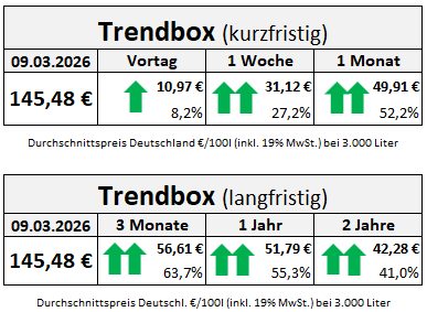Betrachten wir die längerfristige Preisentwicklung, zeichnet sich das Ausmaß der aktuellen Heizölpreis-Anstiege mittlerweile sehr deutlich ab. So zahlen Käufer von Heizöl derzeit +56,61 Euro mehr als vergangenen Dezember, entsprechend Aufschlägen von +63,7 Prozent. Blicken wir auf die vergangenen Jahre, stieg der Preis des Heizmittels im Vergleich zu Anfang März 2025 um +51,79 Euro, und auch gegenüber März 2024 stiegen die Kosten um mittlerweile +42,28 Euro, bzw. +41,0 Prozent.