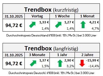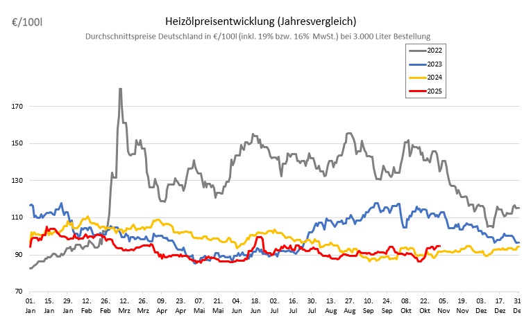 Die genannten Heizölpreise beziehen sich stets auf den deutschlandweiten Durchschnittspreis bei einer Bestellung von 3.000 Liter Heizöl Standard schwefelarm inklusive 19% MwSt. Außerdem fallen durch Transportkosten die Preise regional unterschiedlich aus. Stand der Preise 31.10.2025