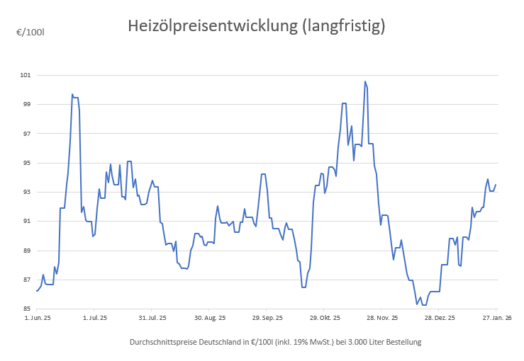 Die genannten Heizölpreise beziehen sich stets auf den deutschlandweiten Durchschnittspreis bei einer Bestellung von 3.000 Liter Heizöl Standard schwefelarm inklusive 19% MwSt. Außerdem fallen durch Transportkosten die Preise regional unterschiedlich aus. Stand der Preise 26.01.2026