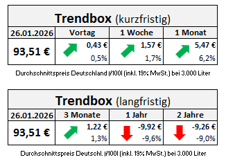 Auf längere Sicht betrachtet zeigt sich aber auch, dass die Heizölpreise in den vergangenen sechs Monaten auch schon deutlich höher lagen als aktuell. Im Vergleich zu Mitte Oktober ergibt sich für die Verbraucherinnen und Verbraucher aktuell ein Plus von +1,22 Euro, doch schon der Vergleich mit Ende November zeigt, dass noch Luft nach oben besteht. Die langfristige Trendbox zeigt zudem, dass die Heizölpreise im Jahresvergleich immer noch eher günstig sind.
