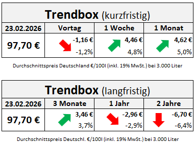 Die Heizölpreise sanken über den vergangenen Wochenabschluss spürbar ab und sind damit aktuell -1,16 Euro günstiger als Freitagnachmittag kurz vor Handelsschluss. Dabei ist die Abschwächung jedoch nur relativ, da die Ölpreise vergangene Woche, aufgrund geopolitischer Spannungen, erheblich angestiegen sind. So zahlen Abnehmerinnen und Abnehmer in Deutschland heute durchschnittlich +4,46 Euro mehr als vor einer Woche und +4,62 Euro mehr als vor einem Monat.