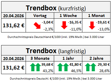 Die langfristige Preisentwicklung macht weiterhin deutlich, wie viel Höher die aktuellen Preise im Vergleich zu den letzten Monaten und Jahren sind. So zahlen Abnehmer von Heizöl aktuell +39,68 Euro mehr als zur Vorsaison im Januar. Und auch mit den vorherigen beiden Jahreswerten verglichen sind die aktuellen Preise in der Bundesrepublik noch immer deutlich teurer. So zahlen Käufer von Heizöl aktuell +41,80 Euro mehr als noch vor einem Jahr, und +29,30 Euro mehr als im April 2024.